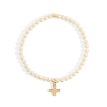 (KID SIZE) Pearl & Gold Beaded Bracelet with Cross- Waterproof 18K Gold PVD Stainless Steel
