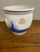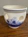 This charming vintage Delft-style cachepot features classic hand-painted blue and white Dutch scenery, including a windmill and sailboat. The design is accented by circular cutouts around the sides, giving it a distinctive look perfect for use as a planter, decorative bowl, or utensil holder.