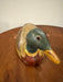 This vintage hand-painted wooden mallard duck decoy features naturalistic detailing with soft green, brown, tan, and red tones. Its glass eyes add a lifelike touch, while the aged finish brings out its rustic folk art charm.