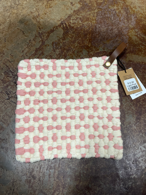 8" Square Cotton Crocheted Pot Holder w/ Leather Loop, Multi Color, 4 Colors