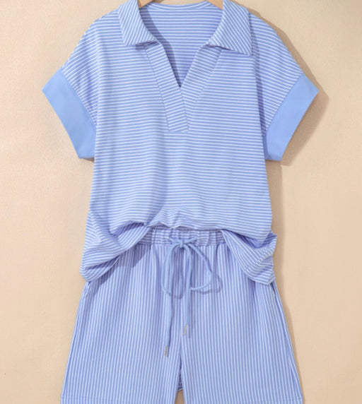 Striped Blue Dolman Sleeve 2 Piece Polo Short Set