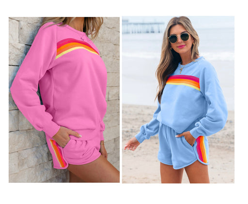 Striped Crew Neck Sweatshirt & Shorts Set. Available in Pink & Blue.