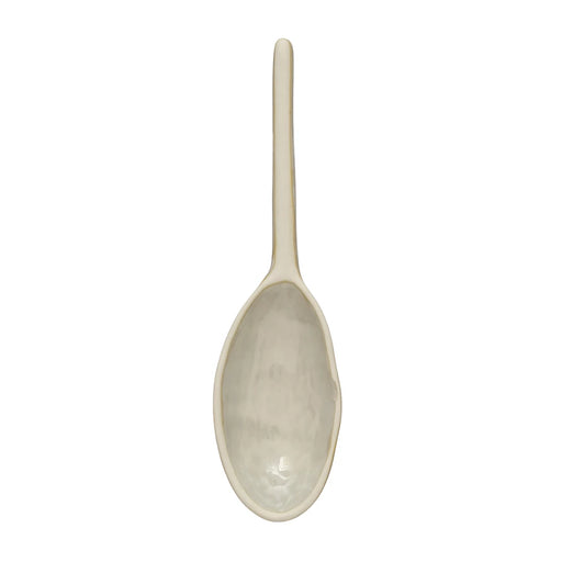 in stockMaterials: 100% Stoneware 8"L Stoneware Spoon, Reactive Glaze, White (Each One Will Vary) Dimensions: 8.0 x 2.1