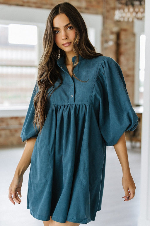 Only 1 left!This Teal Corduroy Dress combines textured style with a flattering empire waist that enhances your silhouette. Featuring snap buttons for easy wear...
