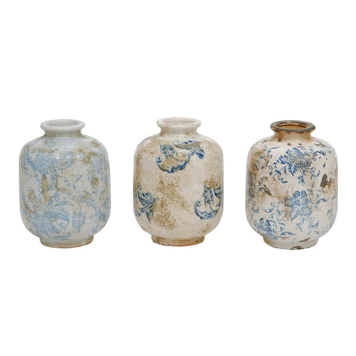 Only 1 left!4" Round x 5-3/4"H Terra-cotta Vase w/ Transferware Pattern, Blue & White, 3 Styles Crafted from terra cotta and showcasing a curved bud silhou...