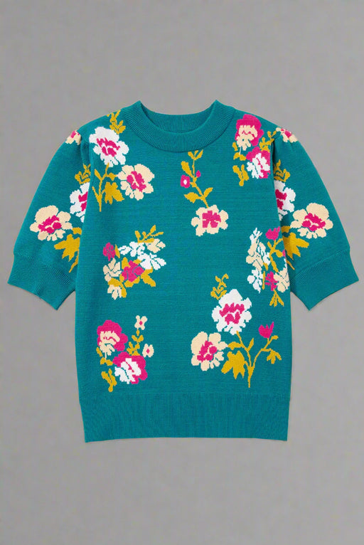 Teal Floral Mock Neck Short Sleeve Knitted Sweater Top