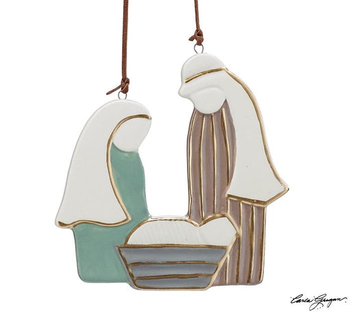 in stockHoly Family shaped ceramic ornament. Mary is in blue kneeling, Joseph is in brown standing, and Baby Jesus is in gray bed. All are in one piece and...