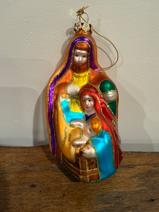 Only 1 left!A beautifully detailed vintage glass ornament featuring the Holy Family in vibrant hand-painted colors with gold glitter accents. Lightweight, eye-...