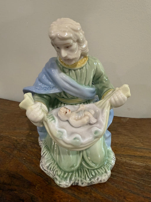 Beautiful vintage porcelain figurine featuring Joseph gently holding Baby Jesus in a cloth cradle. This piece has soft pastel colors, a glossy glaz...
