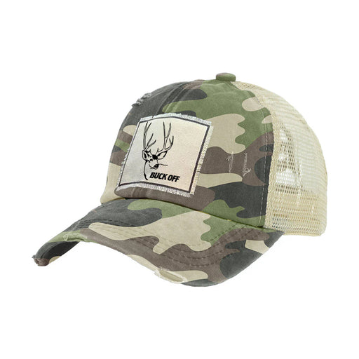 Only 2 left!Buck Off Vintage Distressed Trucker Adult Hat ✔ PERFECT FOR: Those who adore comical outdoor humor. ✔ COLOR: Camo✔ MATERIAL: Cotton/Polyester blend...