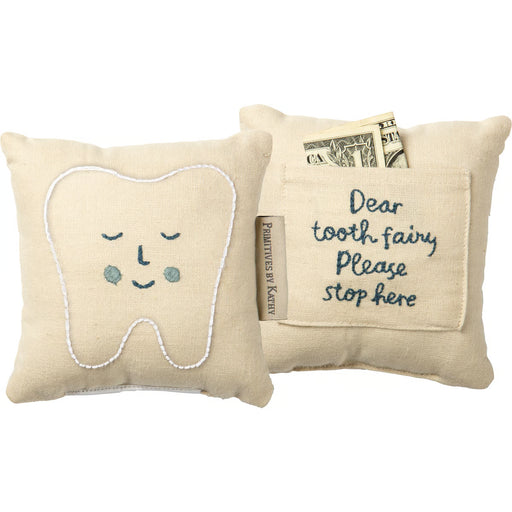 in stockA double-sided cotton linen blend pillow from our Baby & Kids Collection featuring embroidered tooth design on front, and "Dear Tooth Fairy Ple...
