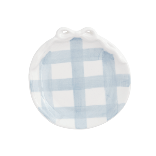 in stockGingham Bow Ring Dish. This charming ceramic ring dish showcases a delightful hand-painted gingham pattern, adding a touch of elegance to your vani...