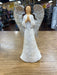 White resin wood carved angel figurines. Angels have brown hair and are wearing long white dresses and are holding a dove, cross, and praying hands.