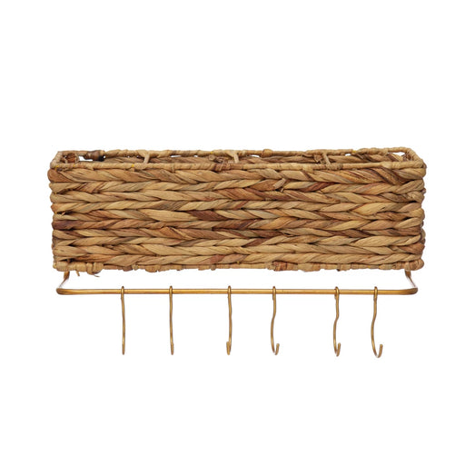Hand-Woven Straw & Metal Wall Basket w/ 4 Sections & 6 Hooks, Natural & Brass Finish