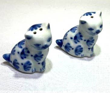 Blue & White Salt and Pepper Shakers, Kitty Cat