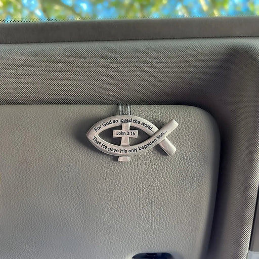 Only 2 left!Auto visor clip in silver enamel finish. Ichthus cross with message “For God so loved the world… That He gave His only begotten Son… John 3:16”. At...
