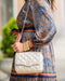 The Elle Crossbody Spotted DQ combines chic design with versatile functionality. Crafted from soft quilted faux lambskin featuring a trendy spotted diamond pattern, it offers a stylish foldover silhouette perfect for any occasion. The adjustable woven chain strap allows you to customize your look, while the classic logo adds a polished touch. Effortlessly elevate your outfit with this fashionable crossbody bag made for day-to-night wear. Dimensions: 9" Length 7" Width 3" Thickness 26" Drop (Single Strap) 16" Drop (Doubled Strap)