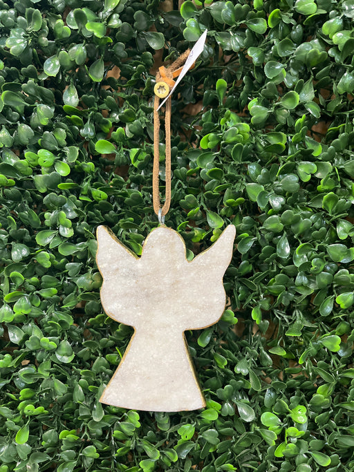 Out of stockBeige marble ornament in cross and angel shapes with gold foiling along sides. Brown faux leather hanger. Made of marble.Height: 4"Width: 3.25"Dept...