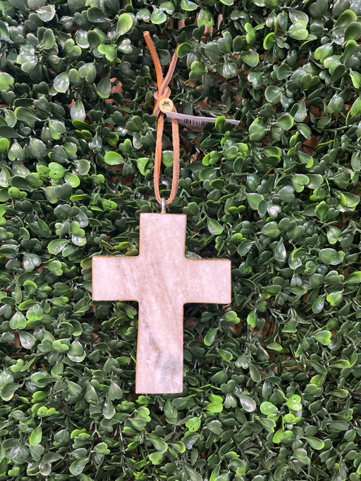in stockBeige marble ornament in cross and angel shapes with gold foiling along sides. Brown faux leather hanger. Made of marble.Height: 4"Width: 3.25"Dept...
