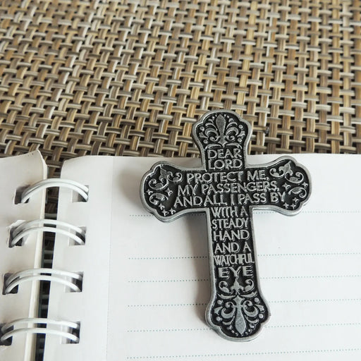 in stockAuto visor clip in bright finished metal. Featuring cross design, complete with inscribed motorist prayer.