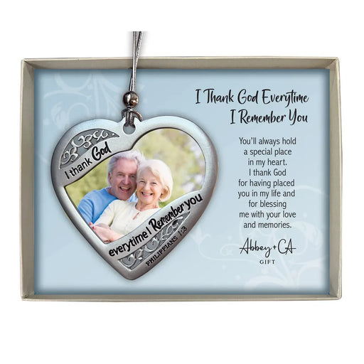 Only 2 left!Heart shaped keepsake photo ornament in silver enamel finish. Engraved blackened type reads "I thank God everytime I Remember you Philippians 1:3"....