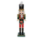 Wooden nutcracker on green base. Nutcracker is red, green, and gold, he holds a mallet and a drum. Wood. Hand painted.