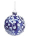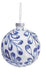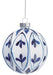 Glass ornament with blue and white designs. Silver cap and loop for hanging.