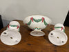 Beautiful vintage-style Christmas ceramic centerpiece set featuring a compote bowl and two matching candleholders. Each piece is decorated with raised holly leaves, red bows, and gold-trimmed accents. A perfect coordinated set for a holiday table, buffet, mantel, or dining room display.