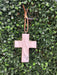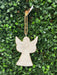 Beige marble ornament in cross and angel shapes with gold foiling along sides. Brown faux leather hanger.