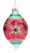 Red and green snowflake glass ornament assortment. The ornaments are made of red translucent glass with gold glitter and sequin snowflakes all around. There is a green sequin in the center of each snowflake and a green painted ring around the top and bottom. Comes in two shapes: a round shape and olive shape. Comes with a gold cap and loop for hanging.
