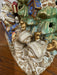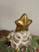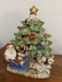 Charming vintage ceramic Christmas figurine featuring Santa in a sleigh with a child, led by reindeer, all nestled beside a beautifully decorated Christmas tree. The piece includes cut-out star shapes designed to glow if you place a small LED light behind it. Rich, glossy colors and gold accents make this a standout holiday décor item.