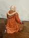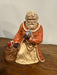 Beautiful vintage Santa Claus figurine featuring Santa kneeling with a sack full of gifts at his side. He holds a small ornament in his gloved hand, and his robe is accented with rope-style trim and gold-tone details. The soft earth-tone color palette and expressive face give this piece a classic, old-fashioned Christmas charm. Perfect for collectors or for adding a traditional touch to your holiday décor.